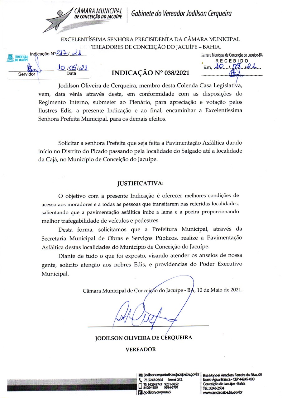 Ainda o Vereador Jodilson Cerqueira solicitou a pavimentação do Picado, região do Salgado e Cajá, destacando que após mudanças territoriais, cerca de 90% d Cajá pertence a Conceição do Jacuípe.