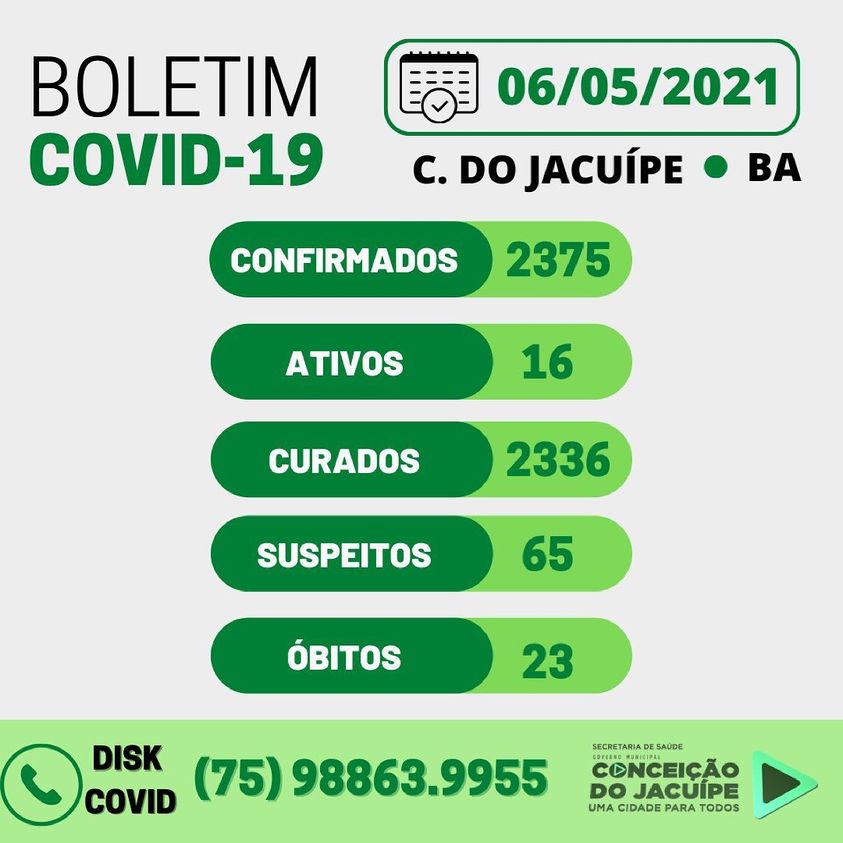 Conceição do Jacuípe, que segundo o IBGE, tem uma população estimada em torno de 34 mil habitantes, já alcançou a media de vacinação rondando os 5 mil, perfazendo um percentual de 14% da população vacinada e 6% currados. (todos os números são aproximados).