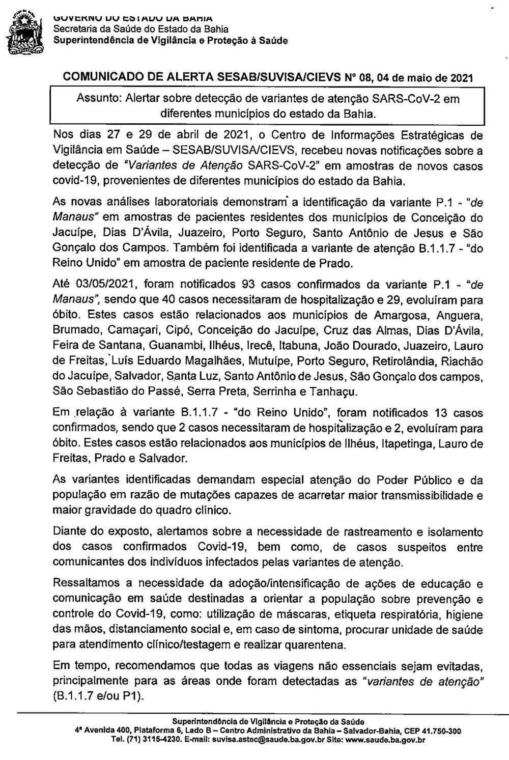 Entre os dias 27 e 29 de abril de 2021, o SESAB detectou a ocorrência de infecção de novas variantes do SARS-CoV-2, emitindo alerta nessa terça-feira, 04 de maio de 2021, sobre estas ocorrências. (abaixo o cumunicado ou pelo link aqui).