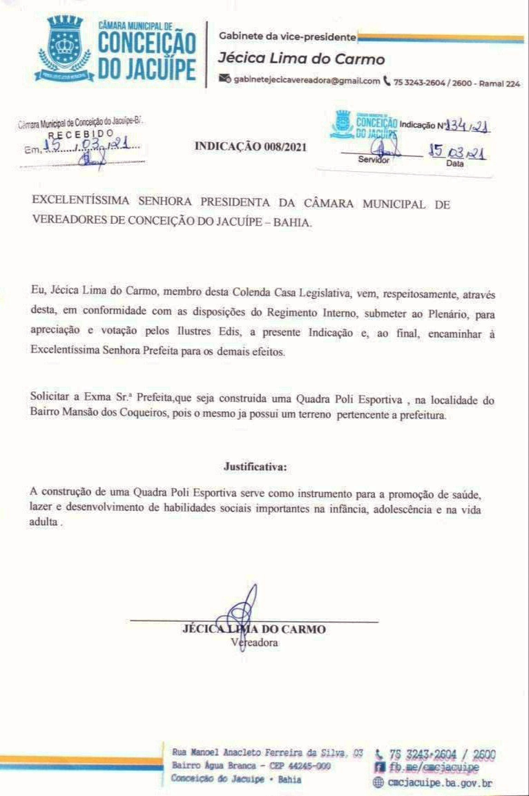 Outra indicação contempla o desejo dos moradores da Mansão dos Coqueiros para que seja construída uma quadra poliesportiva em uma área da prefeitura no local.