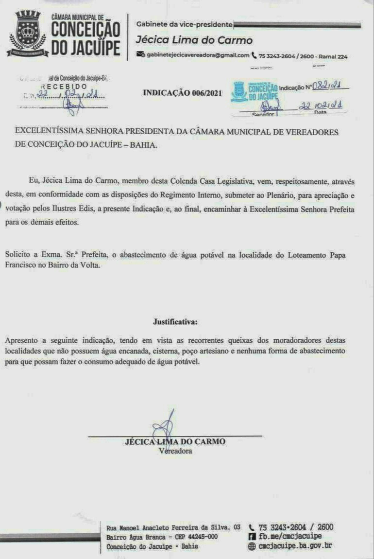 Na sessão desta quarta-feira, 17 de março de 2021, a Vereadora Jécica de Cacau do Boi, apresentou indicação solicitando a regularização do abastecimento de água no Papa Francisco.