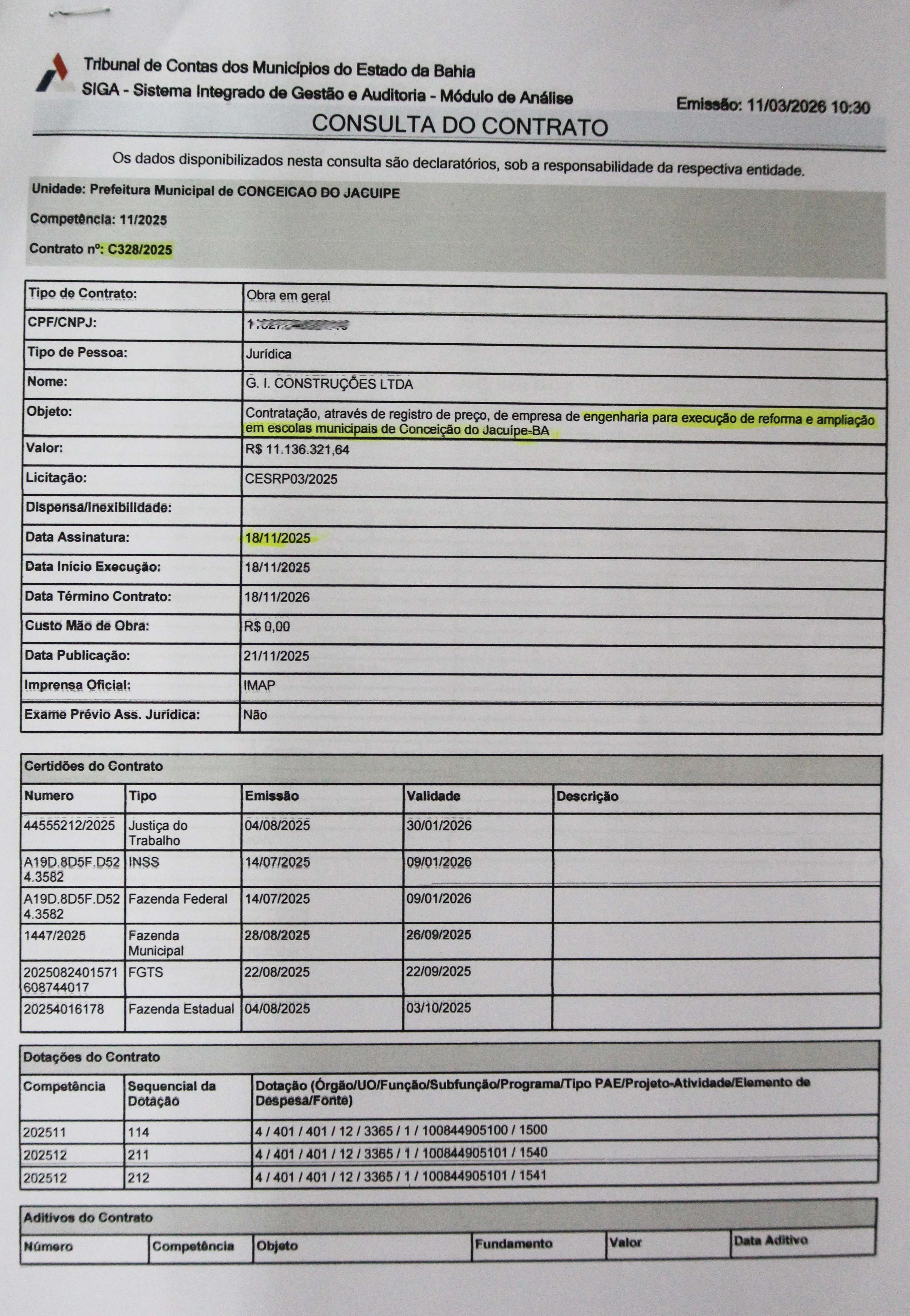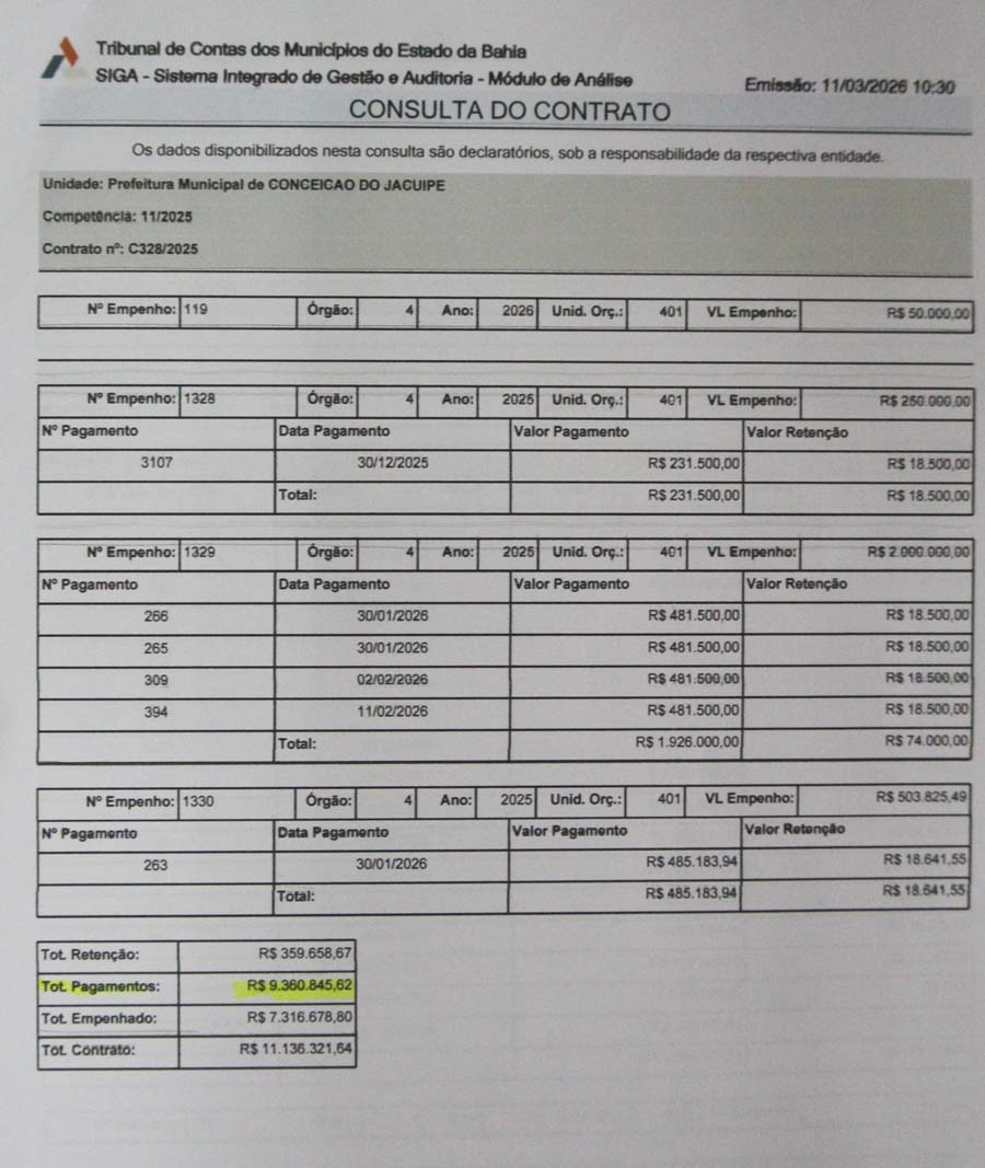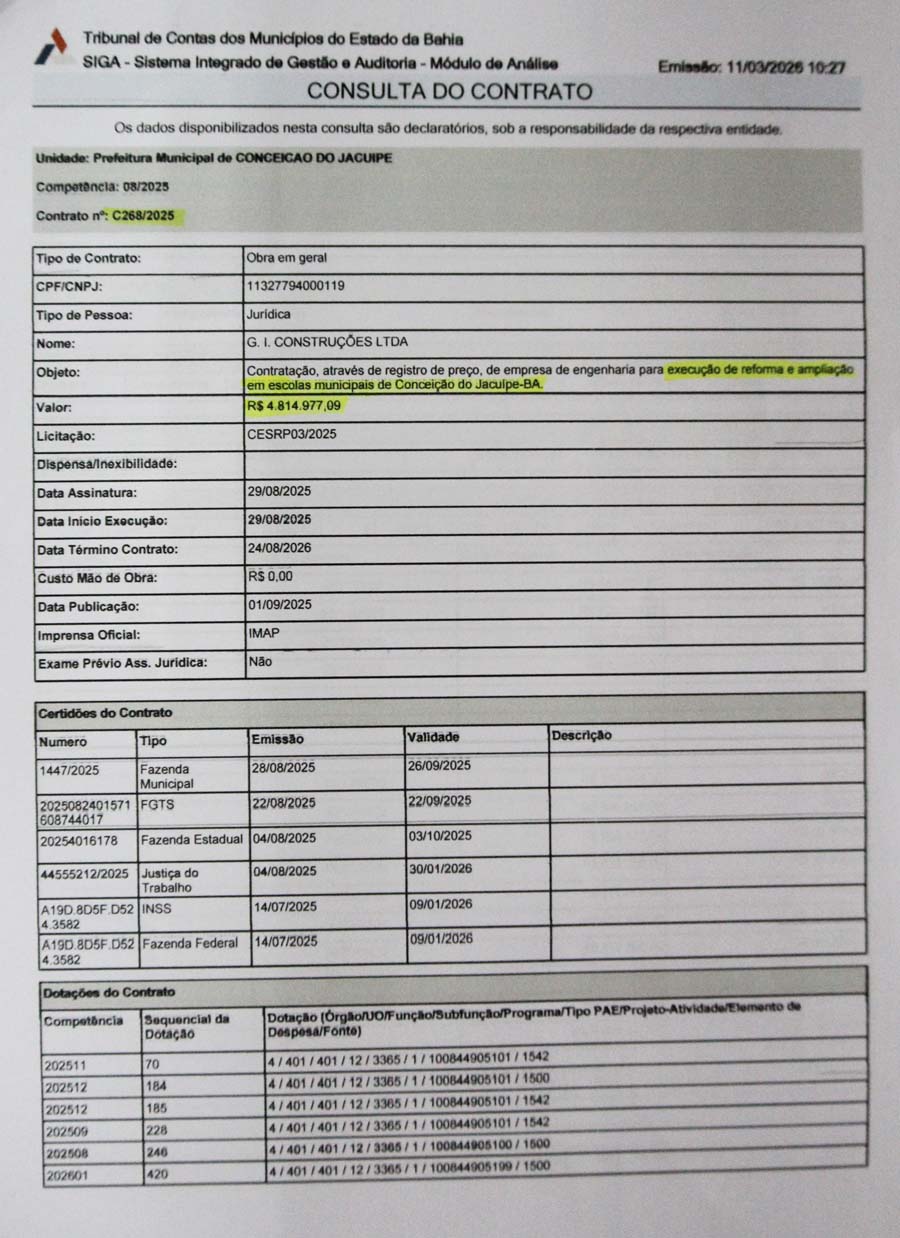 Na sessão da Câmara de Conceição do Jacuípe realizada nesta quarta-feira, 11 de março de 2026, o vereador Denilson levantou questionamentos sobre contratos firmados pela Prefeitura relacionados a obras no município.
