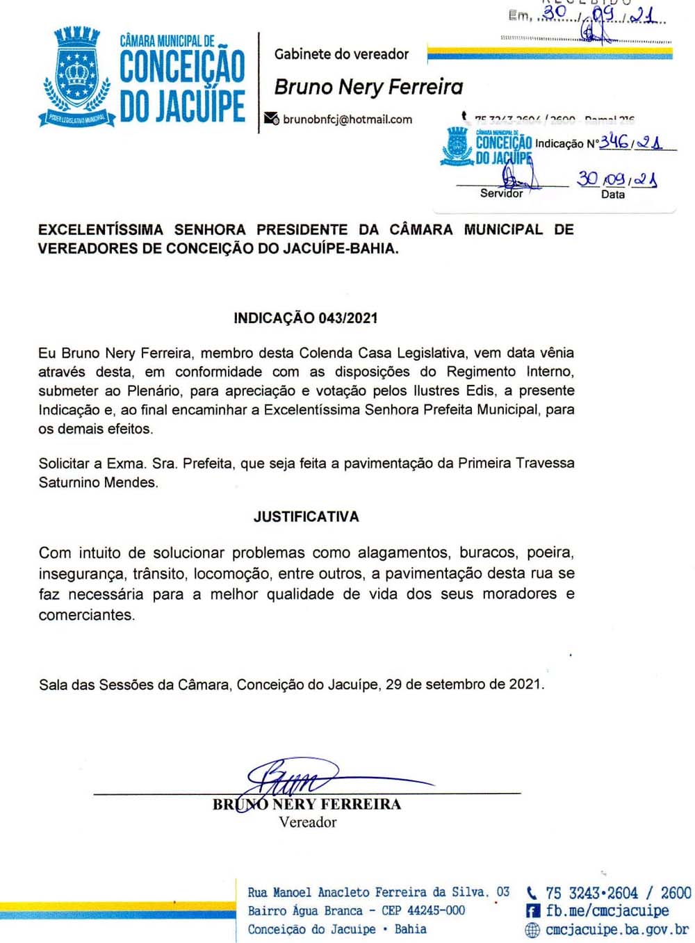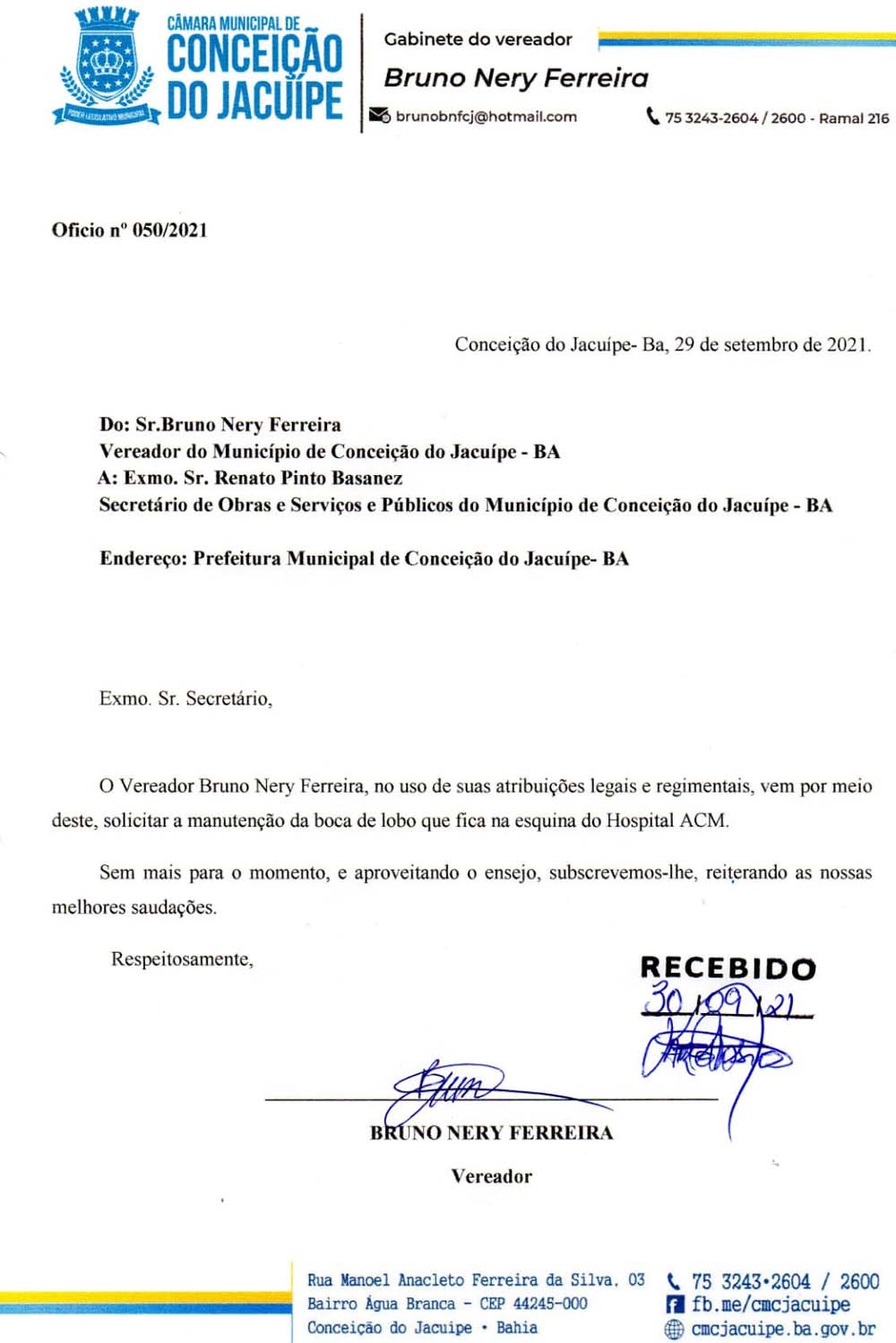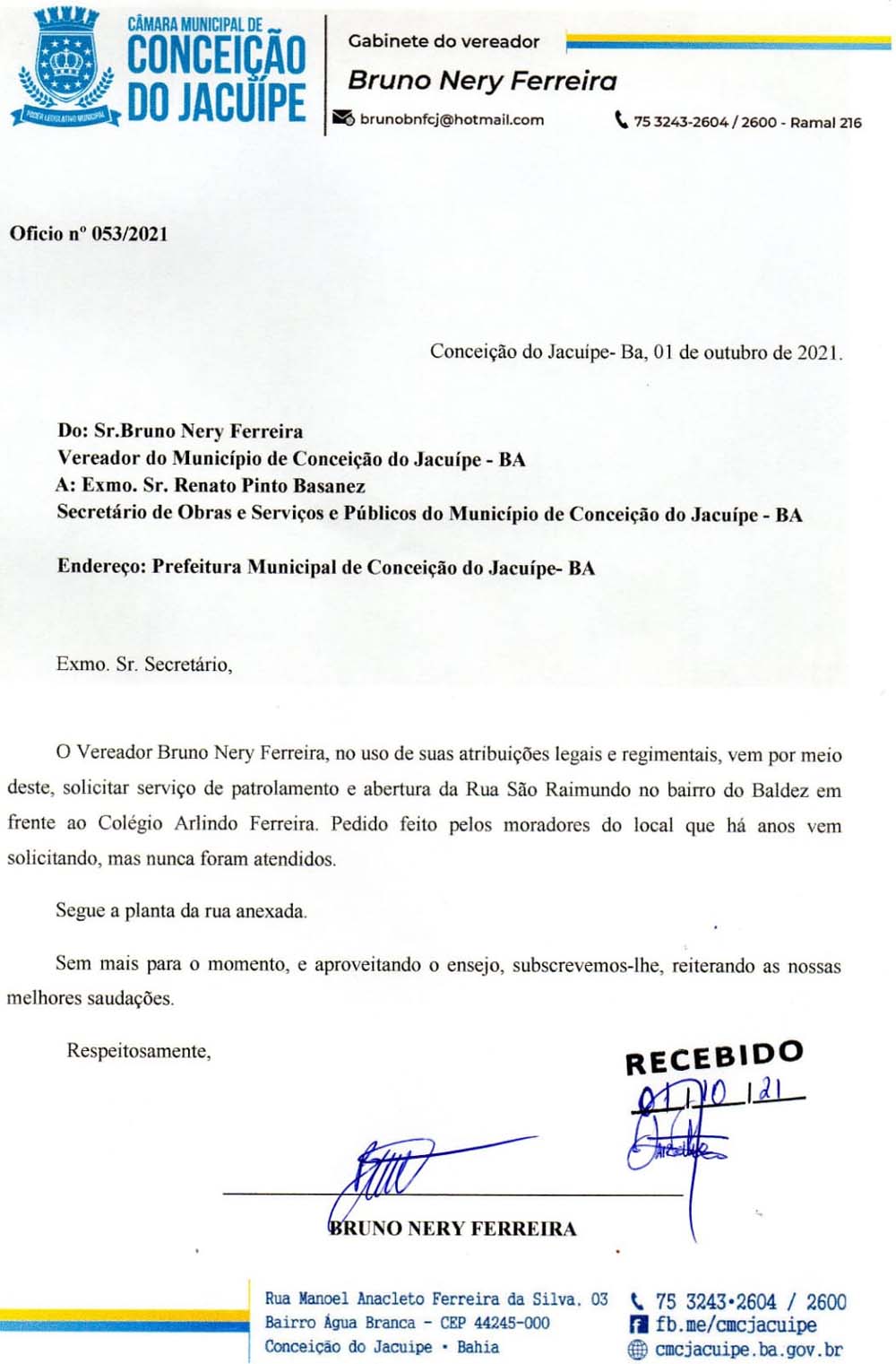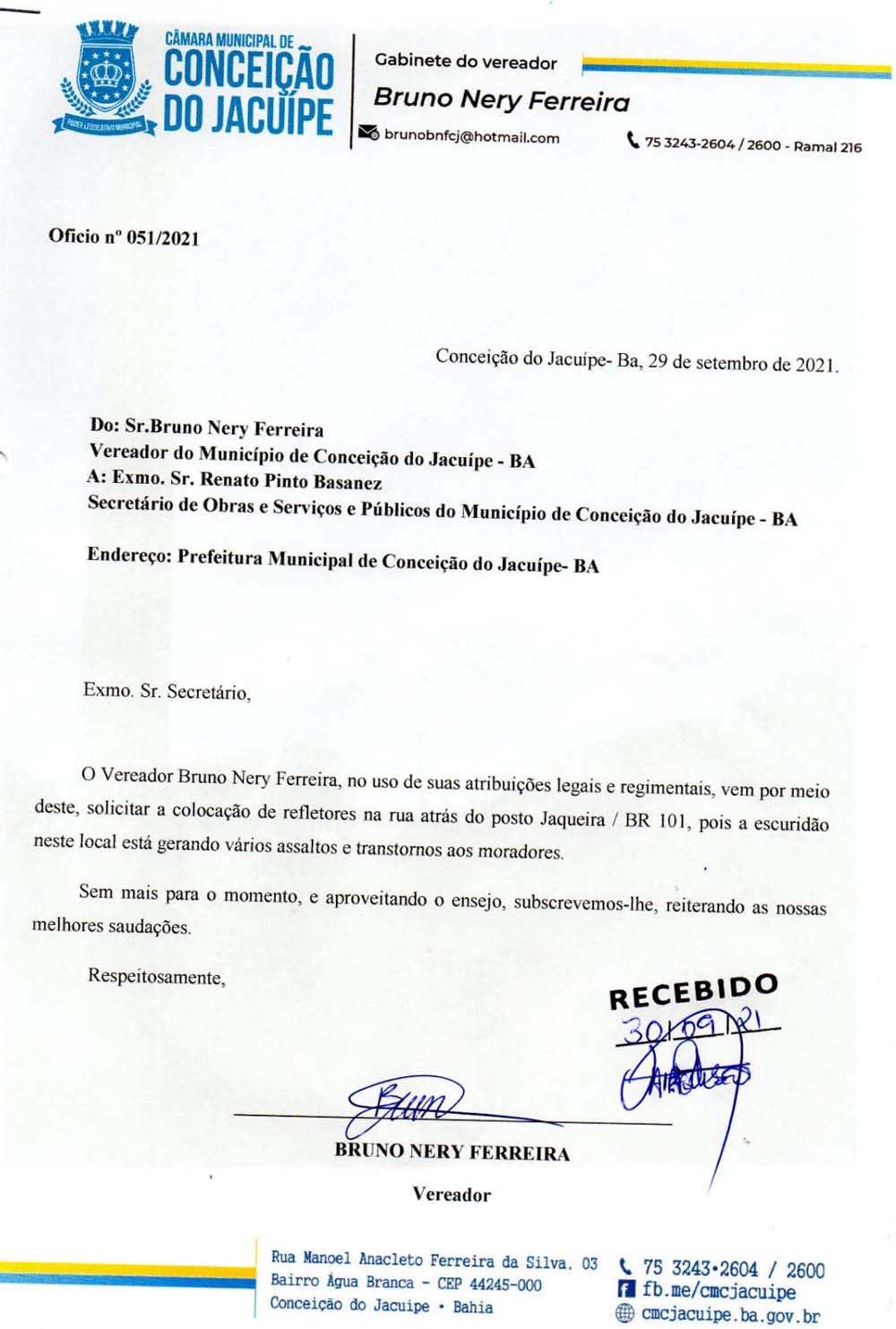 Na sessão desta quarta-feira, 06 de outubro de 2021, o Vereador Bruno Nery relatou varias ações dele junto aos cidadãos de Conceição do Jacuípe, onde, de acordo com as demandas, ele encaminhou ofícios a prefeitura para que sejam sanados os problemas.
