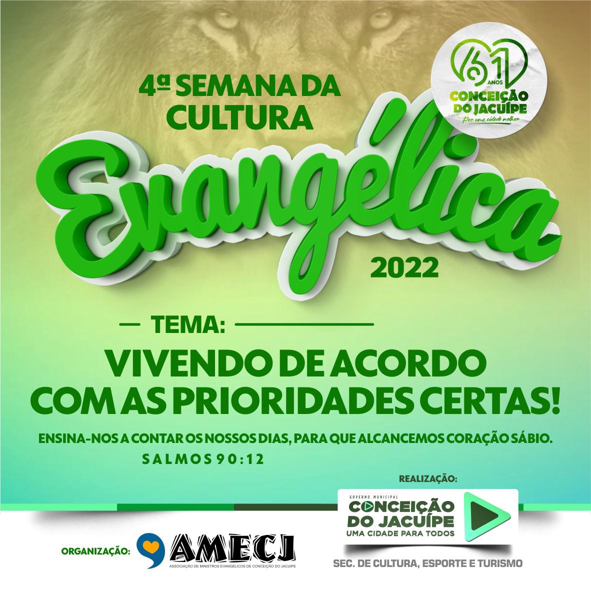 A 4ª Semana da Cultura Evangélica de Conceição do Jacuípe acontecerá entre os dias 21 e 22 de outubro de 2022 e a programação já foi divulgada.