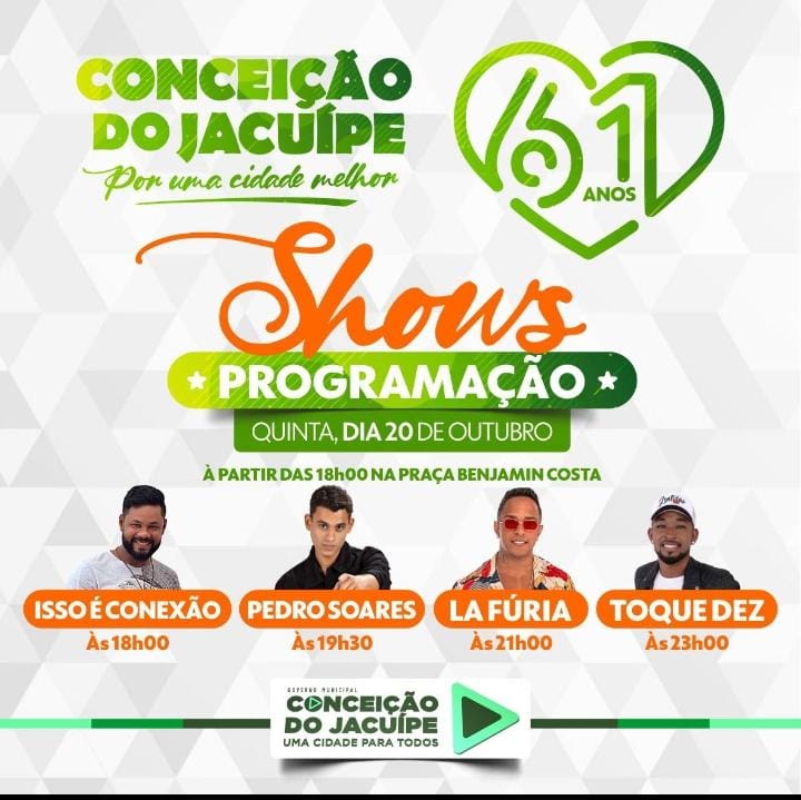 Neste dia 20 de outubro, a Prefeitura de Conceição do Jacuípe comemora oficialmente os seus 61 anos de emancipação política. E para celebrar esta data tão importante, uma programação especial foi preparada.