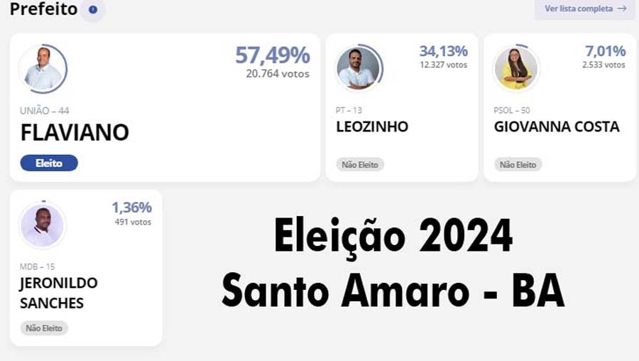 Neste domingo, 06 de outubro de 2024, os eleitores de Santo Amaro elegeram Flaviano como a expressiva votação de 57,49% dos votos.