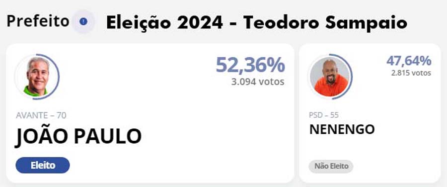 Na eleição deste domingo, 06 de outubro de 2024, o eleitores de Teodoro Sampaio elegeram para Prefeito João Paulo com a maioria dos votos 52,36% dos votos.