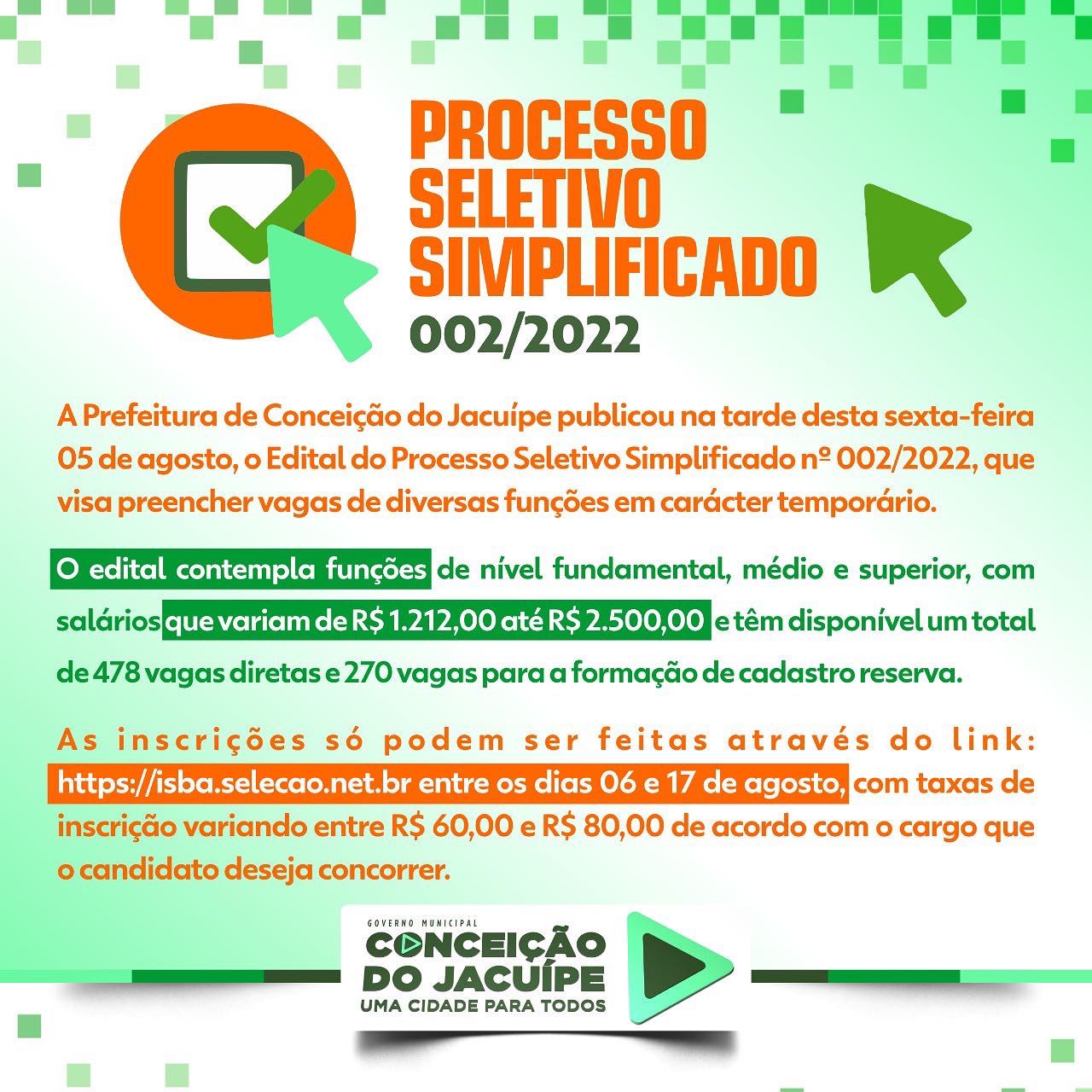 Prefeitura abre processo seletivo simplificado em Conceição do Jacuípe.