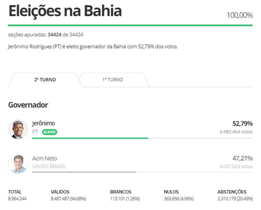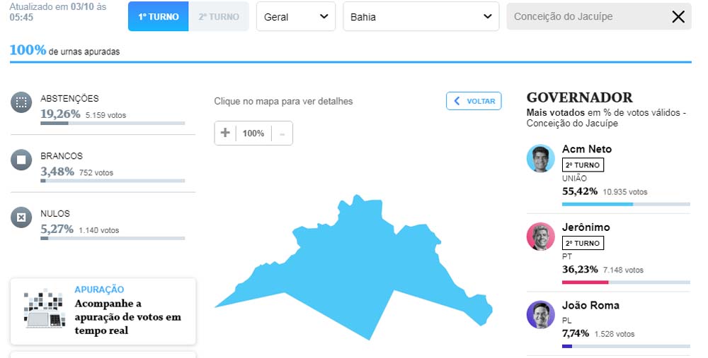 Haverá 2º turno para Presidente e Governo da Bahia. Conheça as votações de Conceição do Jacuípe