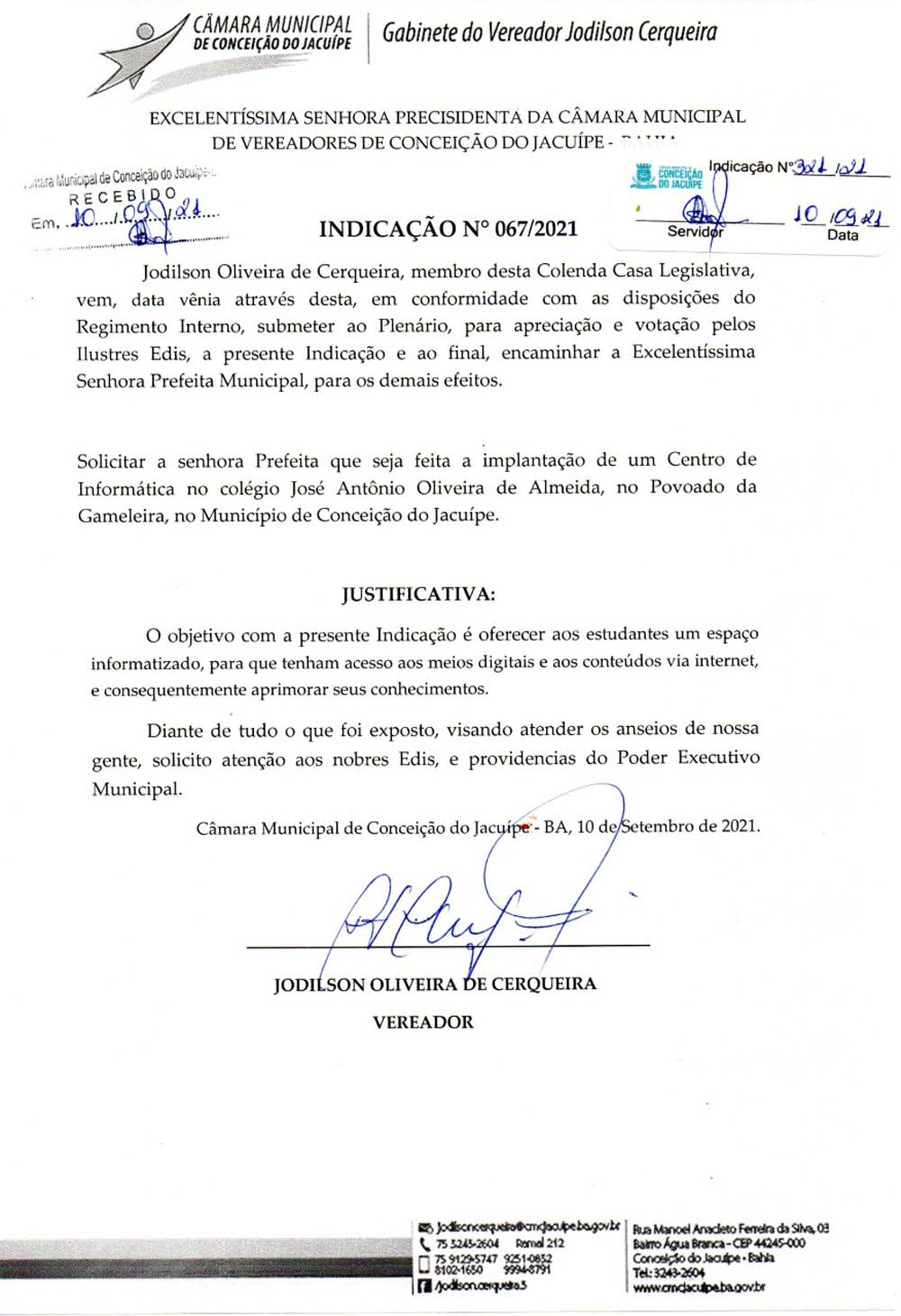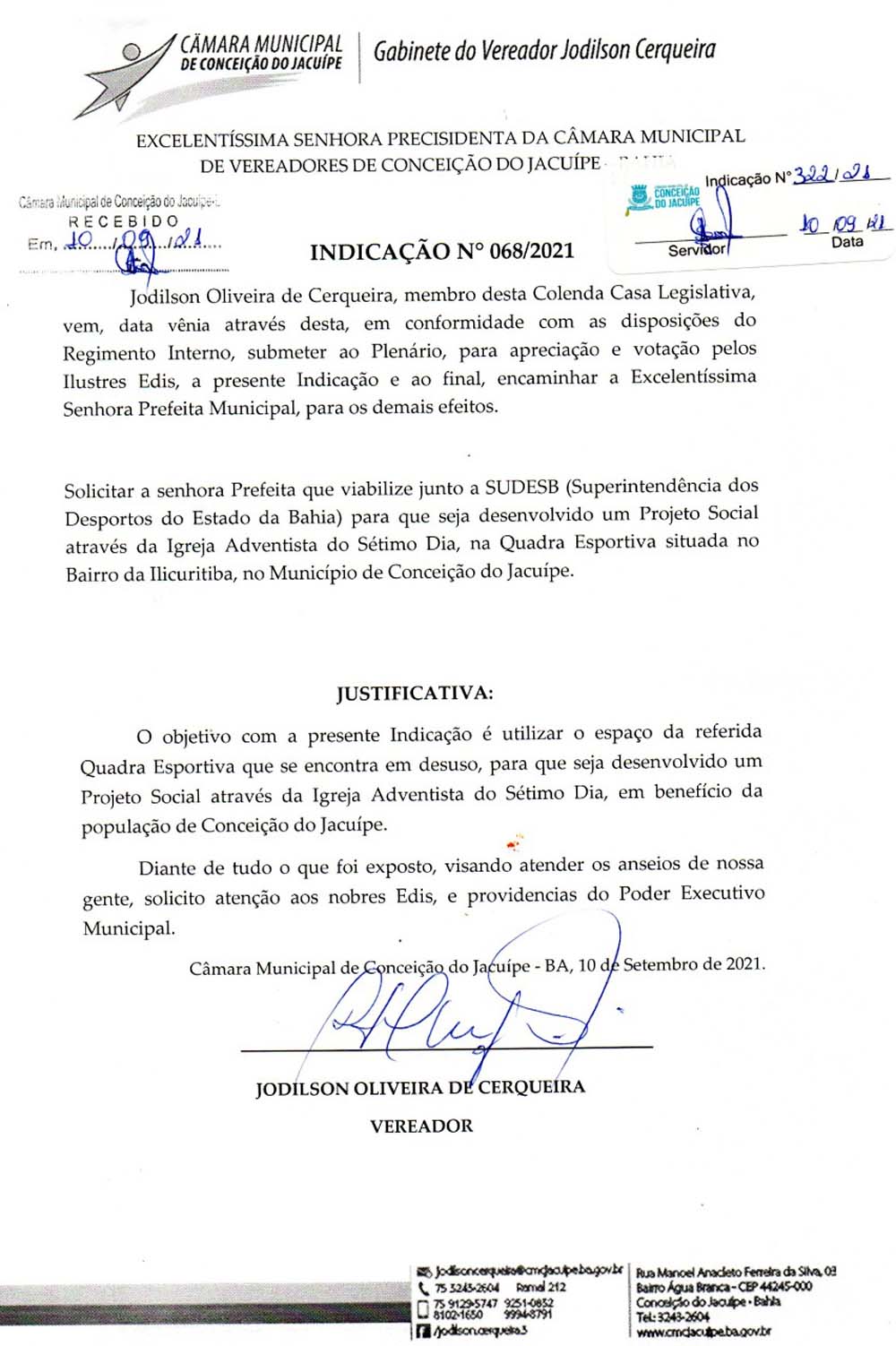 A quadra de esportes da Ilicuritiba é de responsabilidade da SUDESB, governo do Estado, mas esta em desuso a muito tempo, por isso, o Vereador Jodilson Cerqueira solicitou a prefeita de Conceição do Jacuípe que articule junto ao Estado para que no local, seja feita em parceria com a Igreja Adventista, ações e projetos no local. Outra indicação do Vereador Jodilson Cerqueira diz respeito a construção de um centro de informática no colégio da Gameleira. Na sessão desta quarta-feira, 15 de setembro de 2021, vários agentes de saúde e endemias estiveram presentes à Câmara, devido a um projeto de prefeitura onde os agentes de Saúde serão contemplado com um valor, o 14º Salário, que foi justamente uma luta do Vereador Jodilson e indicação dele. (click aqui, e aqui!)