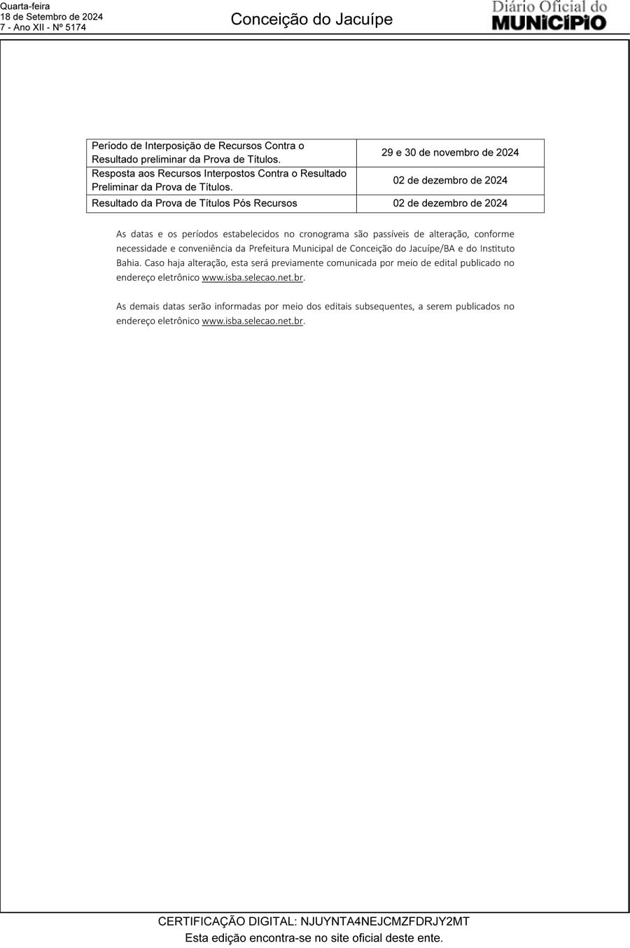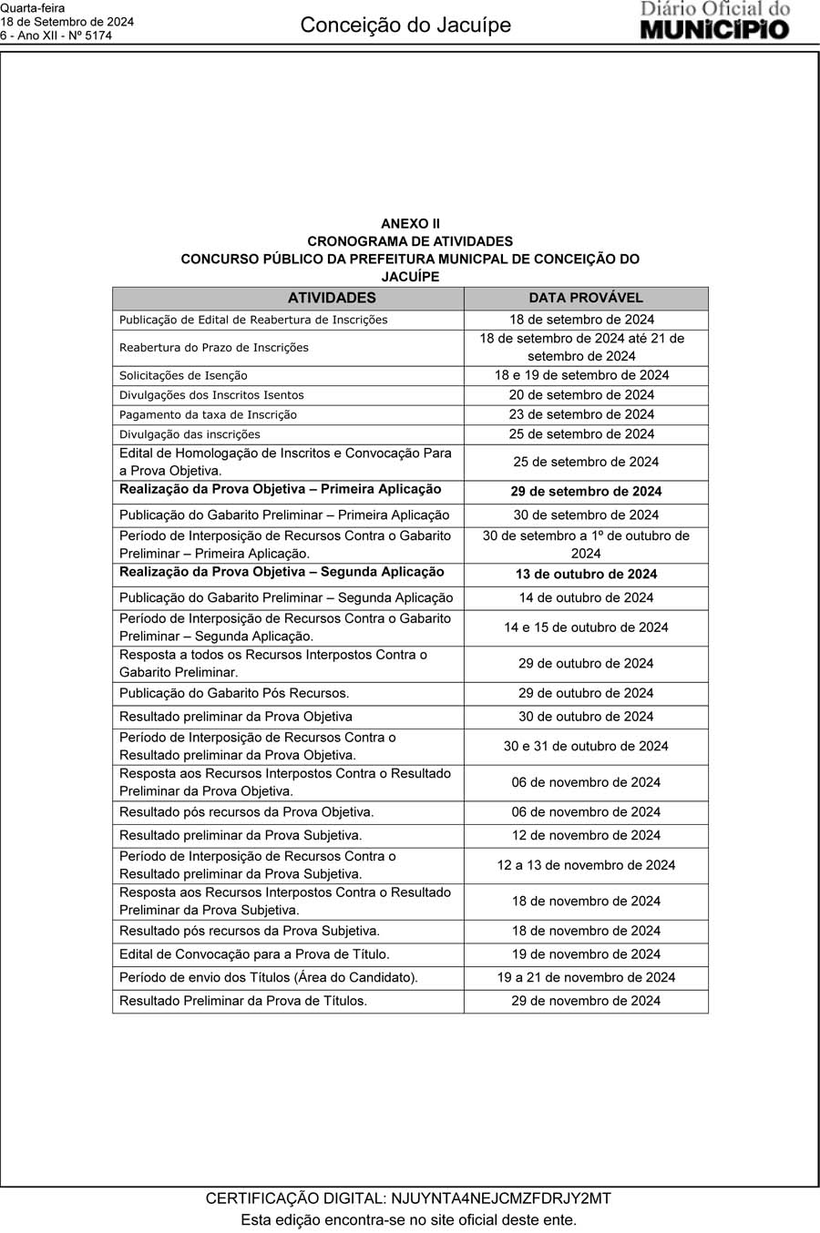A primeira prova será aplicada no dia 29 de setembro de 2024, enquanto a segunda prova está agendada para o dia 13 de outubro de 2024. Essas mudanças buscam assegurar que todos os trâmites legais e organizacionais sejam devidamente cumpridos, garantindo assim maior segurança e justiça para todos os participantes.