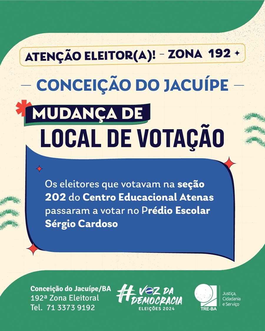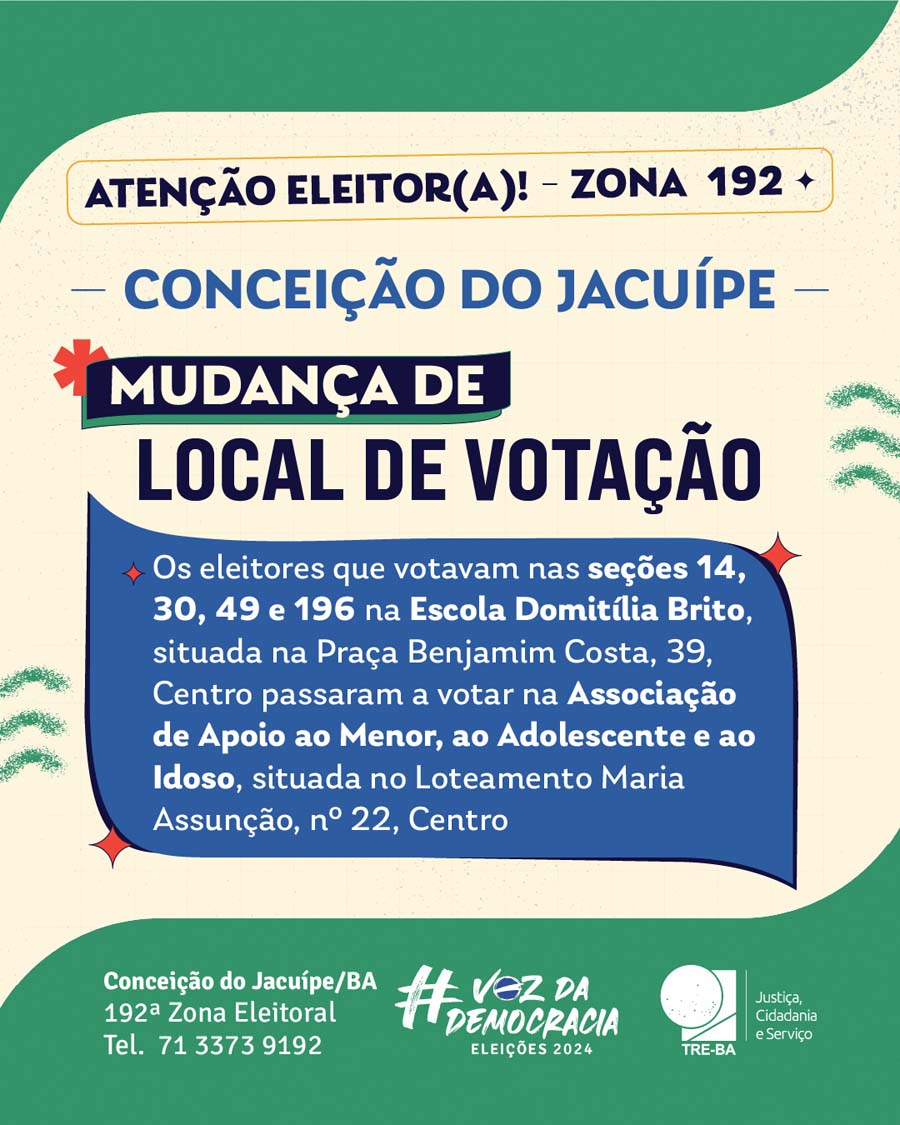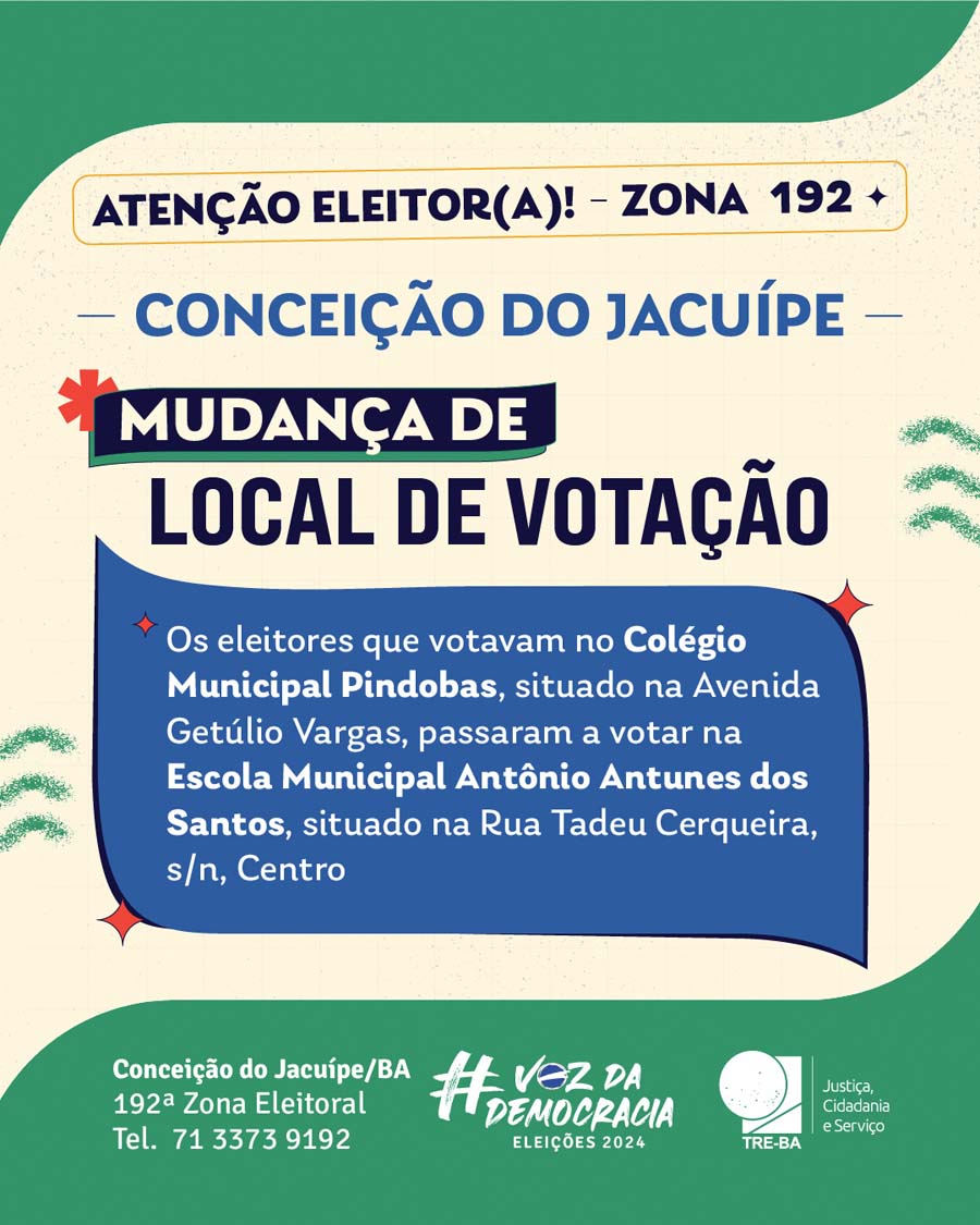 Atenção, eleitores de Conceição do Jacuípe! Para as eleições de 2024, algumas mudanças ocorrerão nos locais de votação, e é essencial que todos verifiquem com antecedência onde devem votar. Essas alterações foram feitas para facilitar o processo eleitoral, mas podem impactar onde você está.