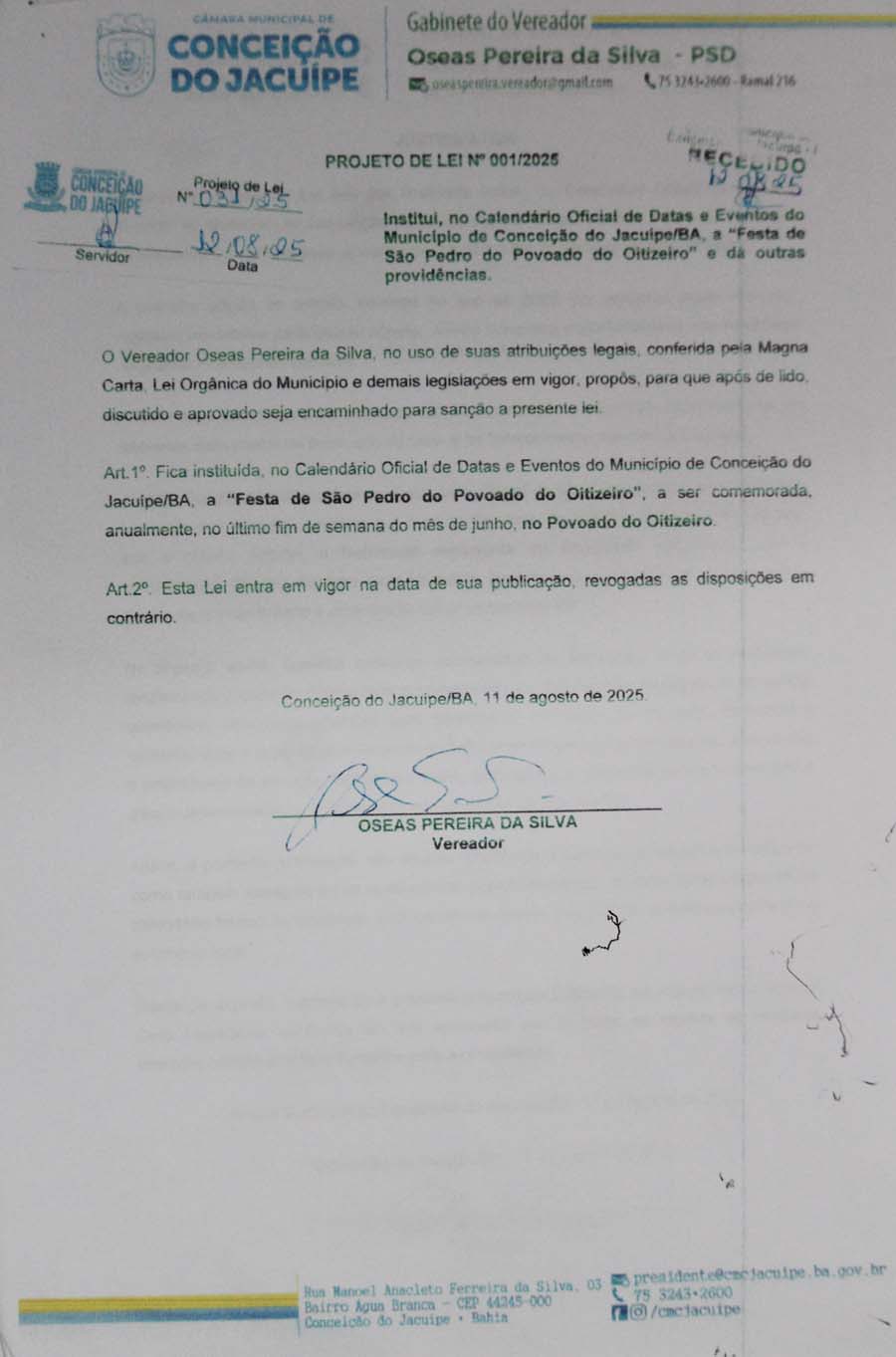 Ainda na mesma sessão, foi aprovado o Projeto de Lei de autoria do Vereador Oseas que institui oficialmente a Festa de São Pedro do Oitizeiro no calendário cultural do município, fortalecendo a tradição local e garantindo reconhecimento oficial ao evento.