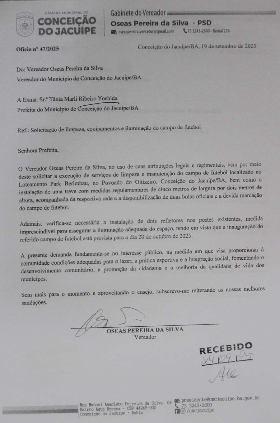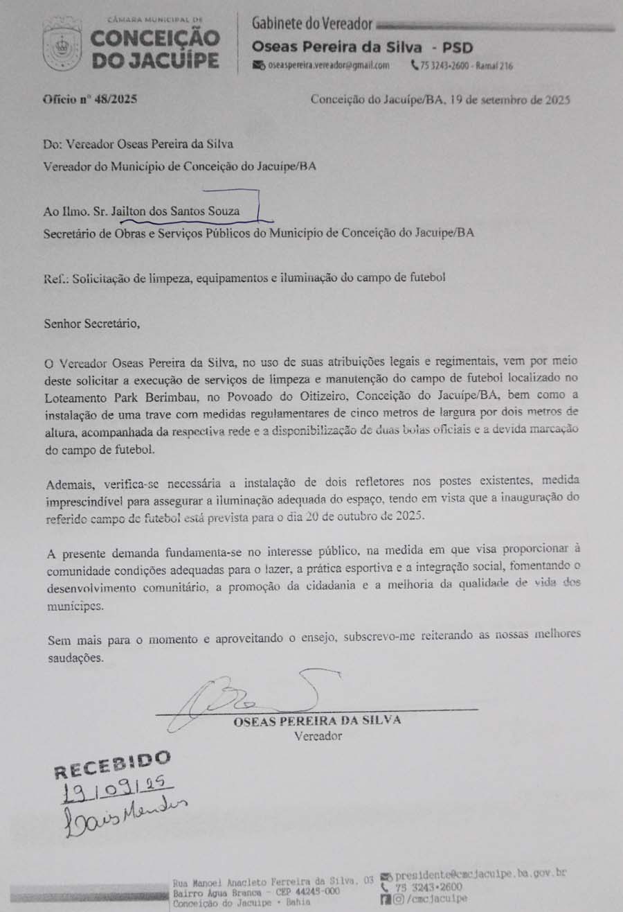 Na sessão da Câmara de Conceição do Jacuípe desta quarta-feira, 24 de setembro de 2025, o Vereador Oseas apresentou ofícios solicitando que o campo de futebol do Oitizeiro seja preparado para inauguração no dia 20 de outubro, data em que o município comemora seu aniversário.