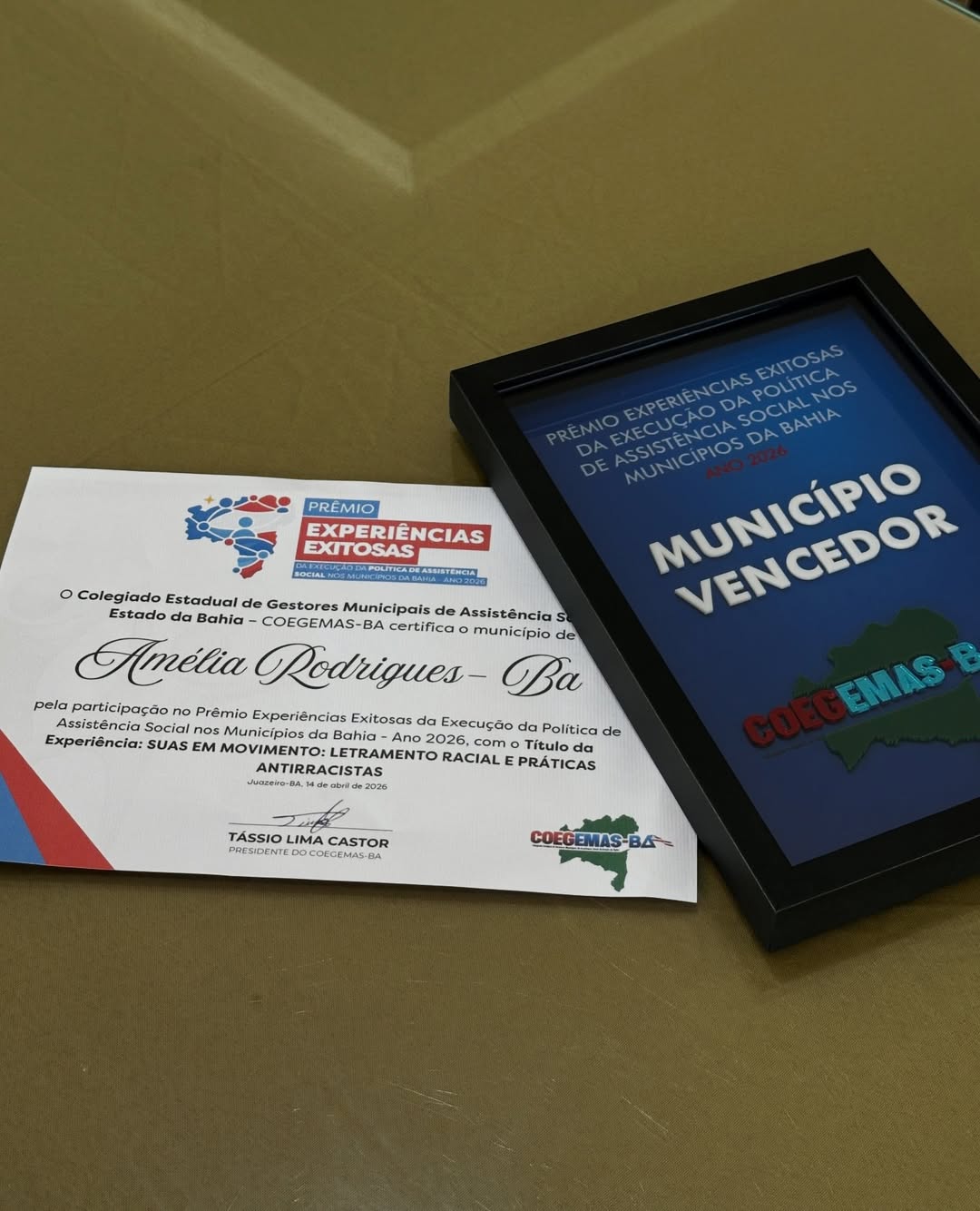 Amélia Rodrigues foi reconhecida pelo COEGEMAS-BA com o Prêmio Experiências Exitosas da Assistência Social, valorizando ações que realmente transformam vidas.