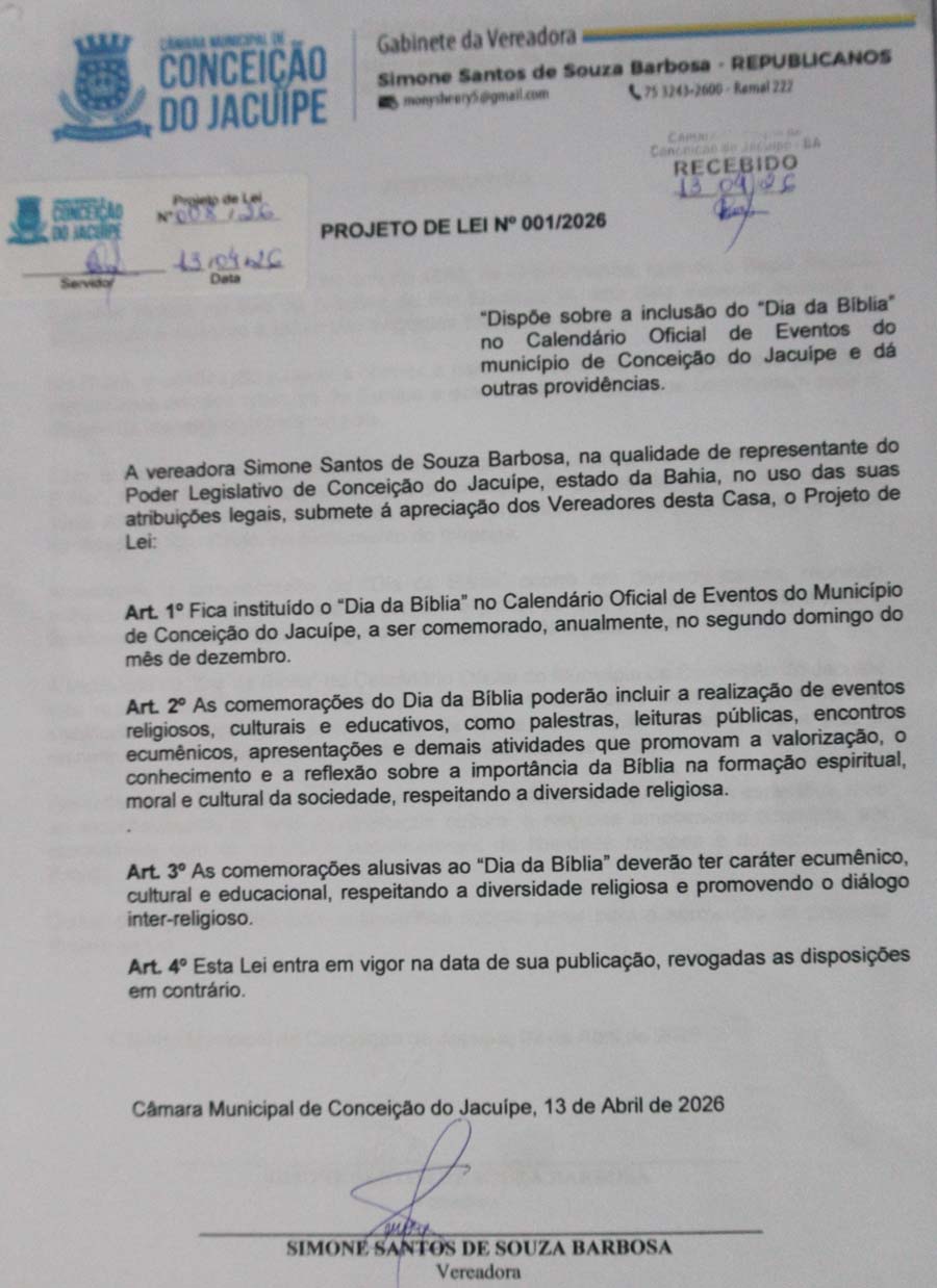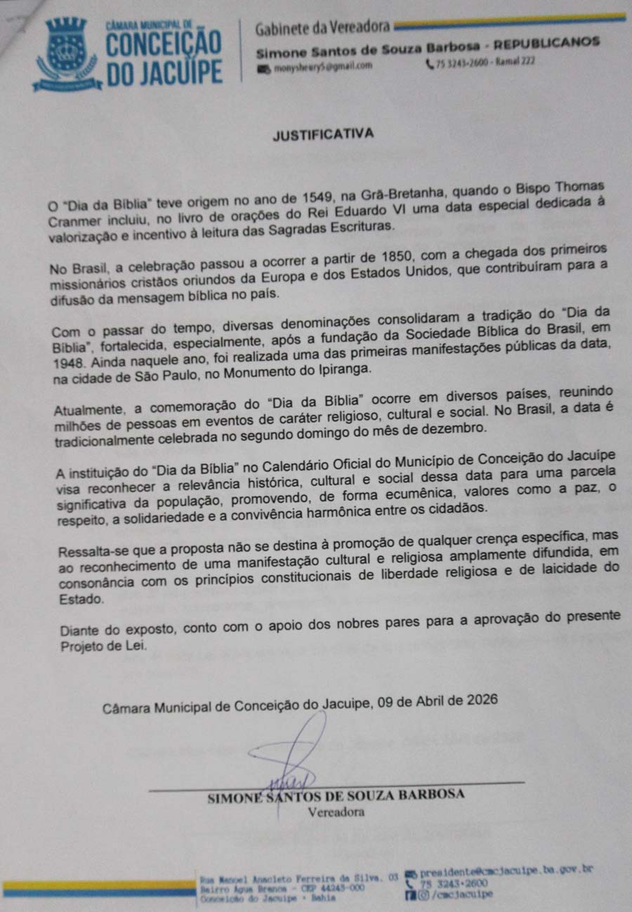 Por fim, a vereadora Simone deu entrada em um projeto de lei que propõe a criação do Dia da Bíblia no município, ampliando sua atuação também na área cultural e religiosa.