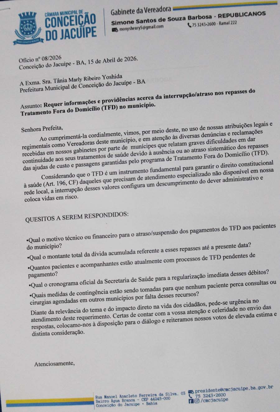 Outro ponto destacado foi o acúmulo de problemas na cidade e o que ela considerou como inversão de prioridades, citando como exemplo os salários atrasados de servidores municipais. Além disso, encaminhou um ofício à Prefeitura solicitando esclarecimentos sobre o atraso no pagamento do Tratamento Fora do Domicílio (TFD).