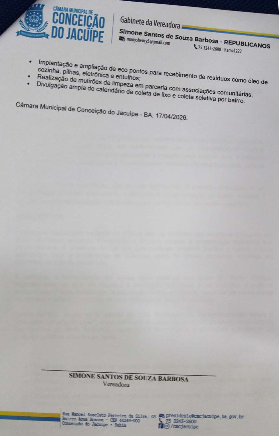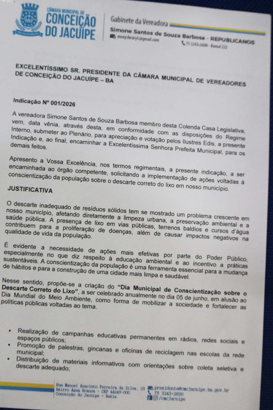 A vereadora Simone destacou que tem plena consciência da situação crítica envolvendo o lixo no município e reconheceu que a indicação, por si só, não resolverá o problema. No entanto, reforçou que uma população mais consciente pode fazer a diferença.