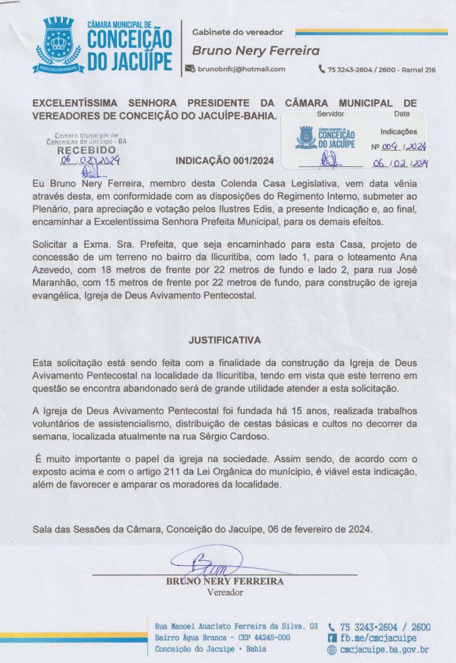 O Vereador Bruno Nery de Conceição do Jacuípe atende a todos os grupos sem distinção alguma e trabalha em favor de todos eles, sendo assim nesta quarta-feira, 21 de fevereiro de 2024, ele entrou com uma indicação solicitando que seja concedido um terreno na Ilicuritiba para a Igreja de Deus Avivamento pentecostal.