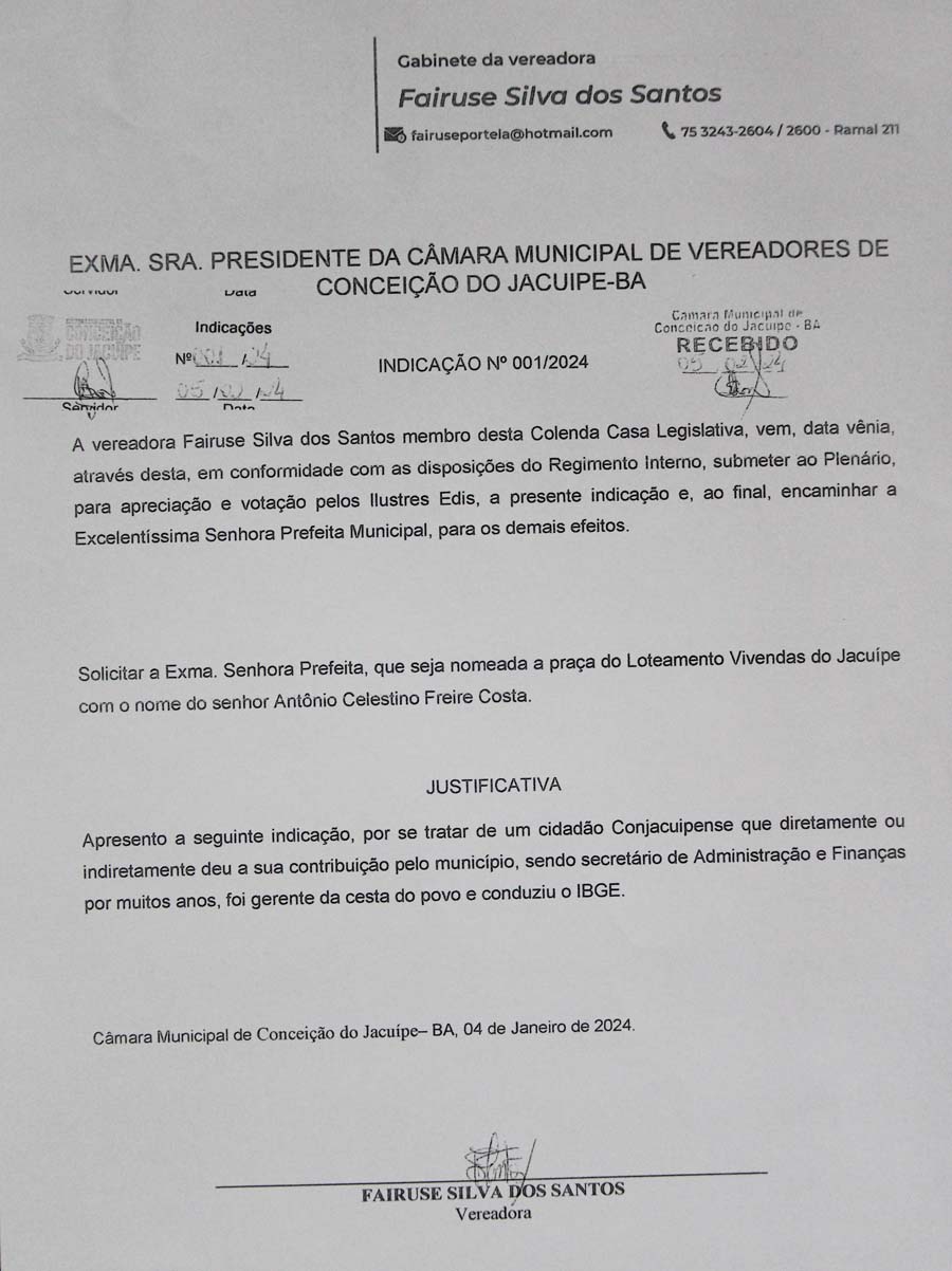 Nesta quarta-feira, 07 de fevereiro de 2024, foram iniciados os trabalhos legislativos da Câmara de Conceição do Jacuípe e a Vereadora Fairuse de Chico da Galinha entrou com a indicação 001/24, solicitando que a Praça do Vivendas do Jacuípe seja nomeada de Antonio Celestino, homenageando assim a memória desta ilustre pessoa.